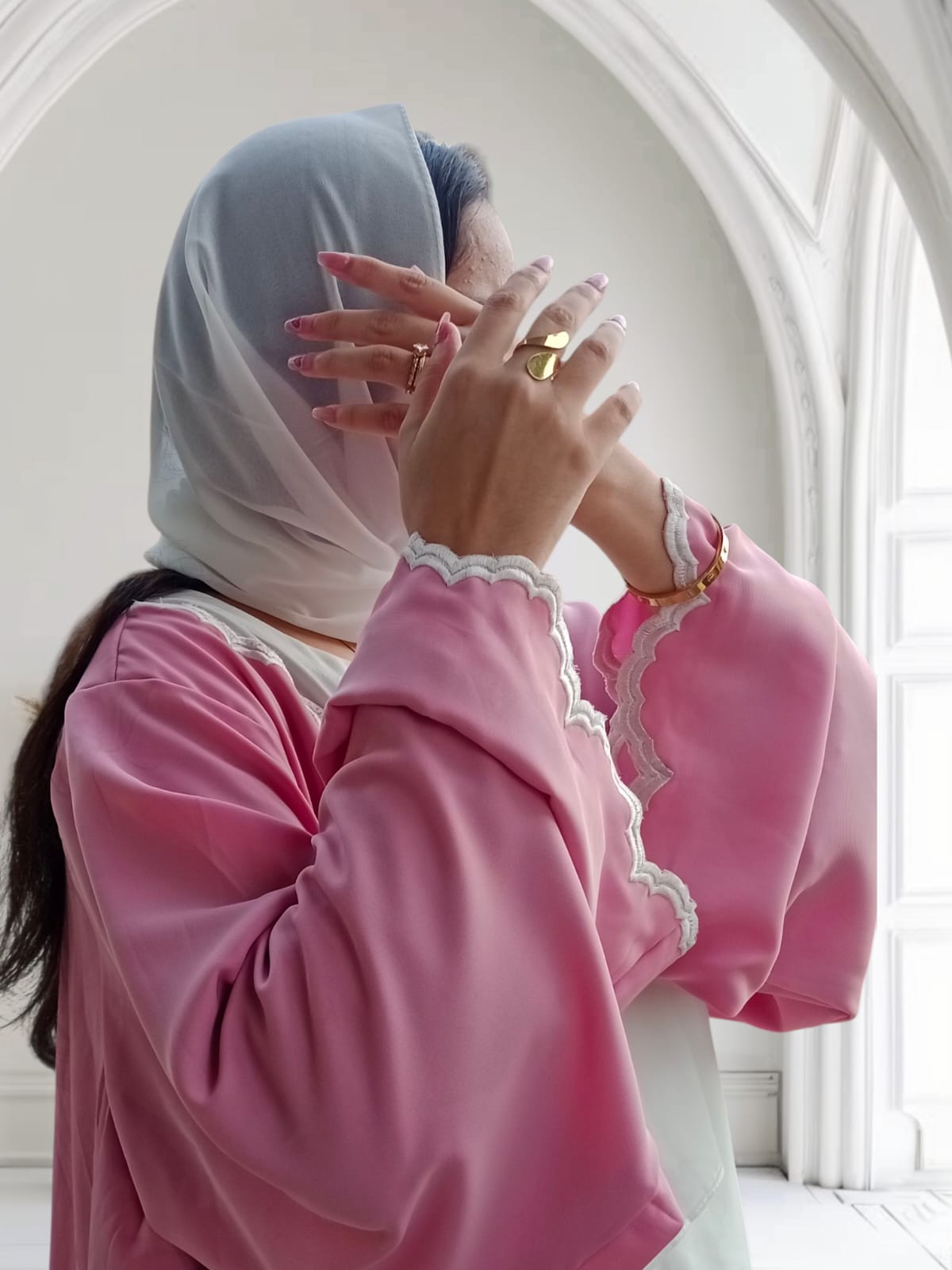 The Blush Noor Double Abaya is a statement of subtle luxury and timeless modesty. Designed with a delicate white inner layer and a soft pink upper layer, this abaya creates a beautifully balanced and graceful look. The cutwork detailing on the pink layer adds depth and elegance, making the design stand out while maintaining a soft and modest aesthetic.
