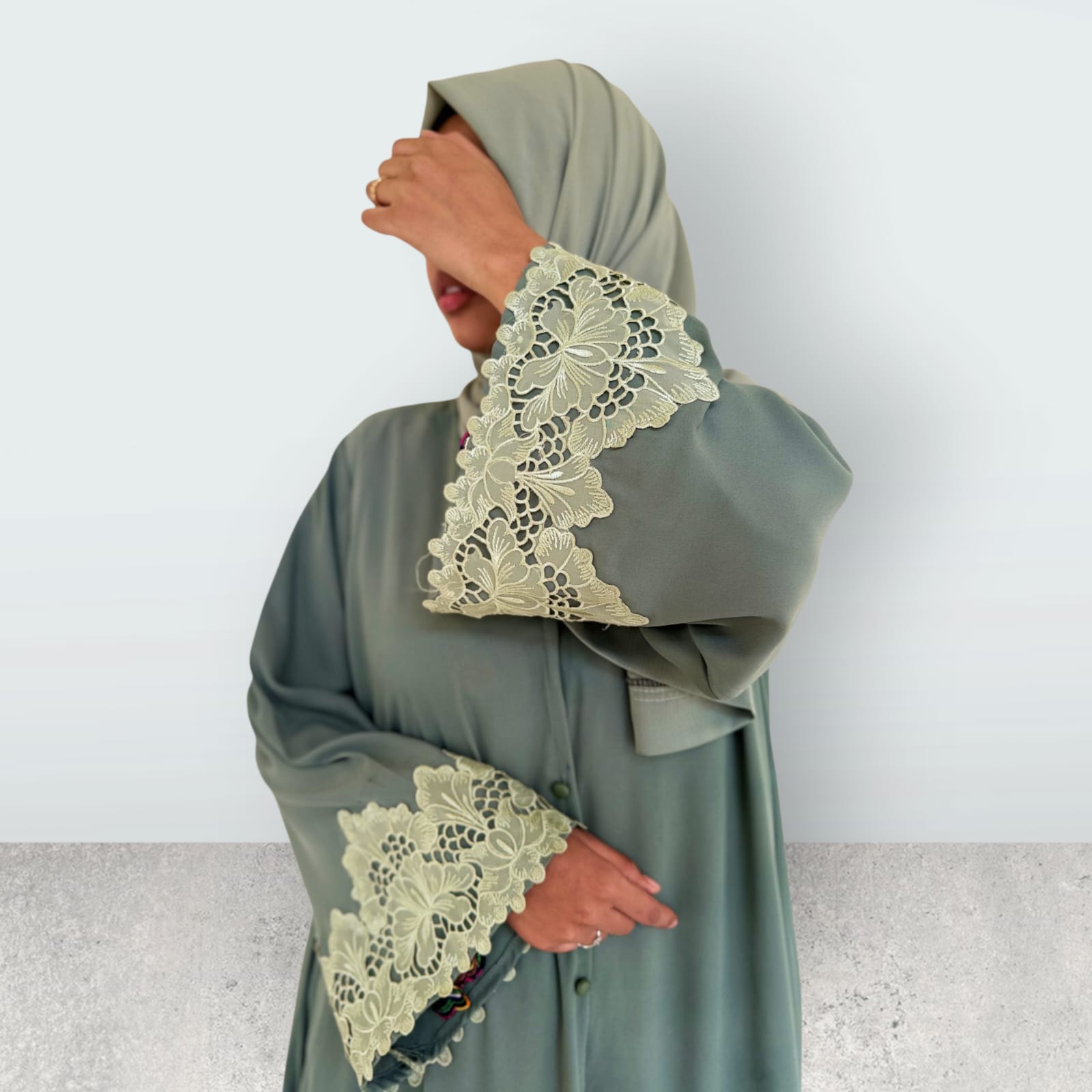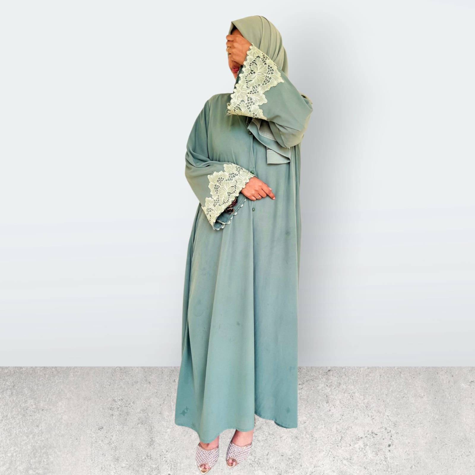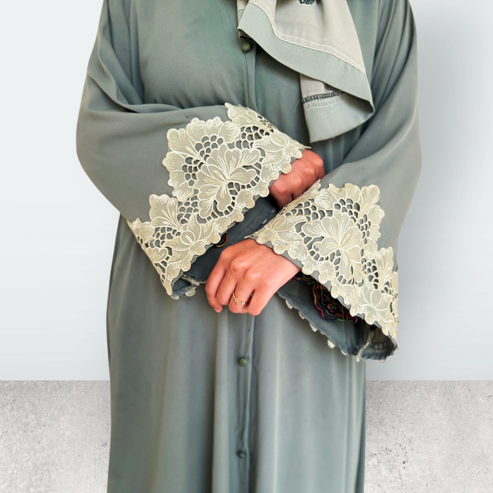 Its rich olive green tone adds a sophisticated charm, while the delicate detailing on the sleeves enhances the overall look without overpowering the simplicity of the design. This subtle yet refined finish makes the abaya suitable for daily wear as well as festive gatherings, Eid celebrations, and formal occasions.